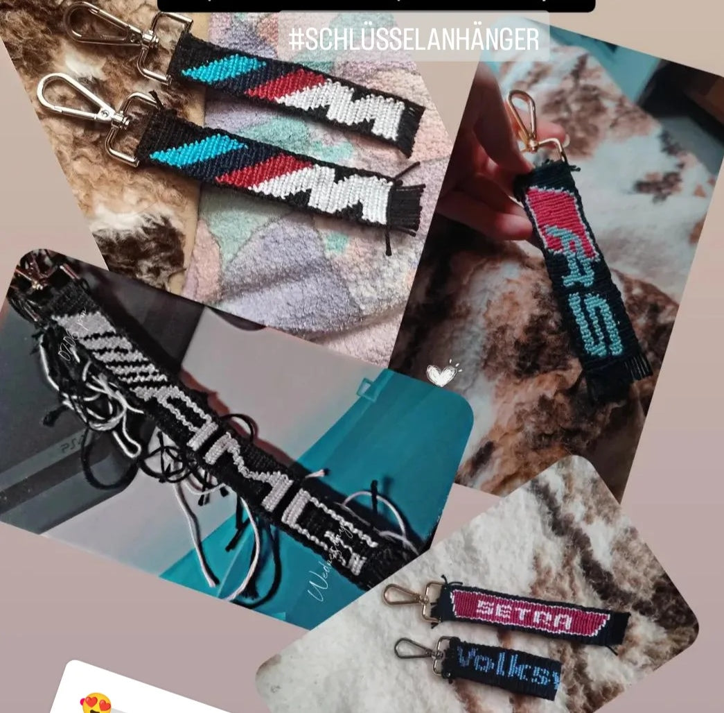 Every keychain is made out of cotton and a stainless steel carabiner. Homemade and handmade. Perfect like you see on the picture.